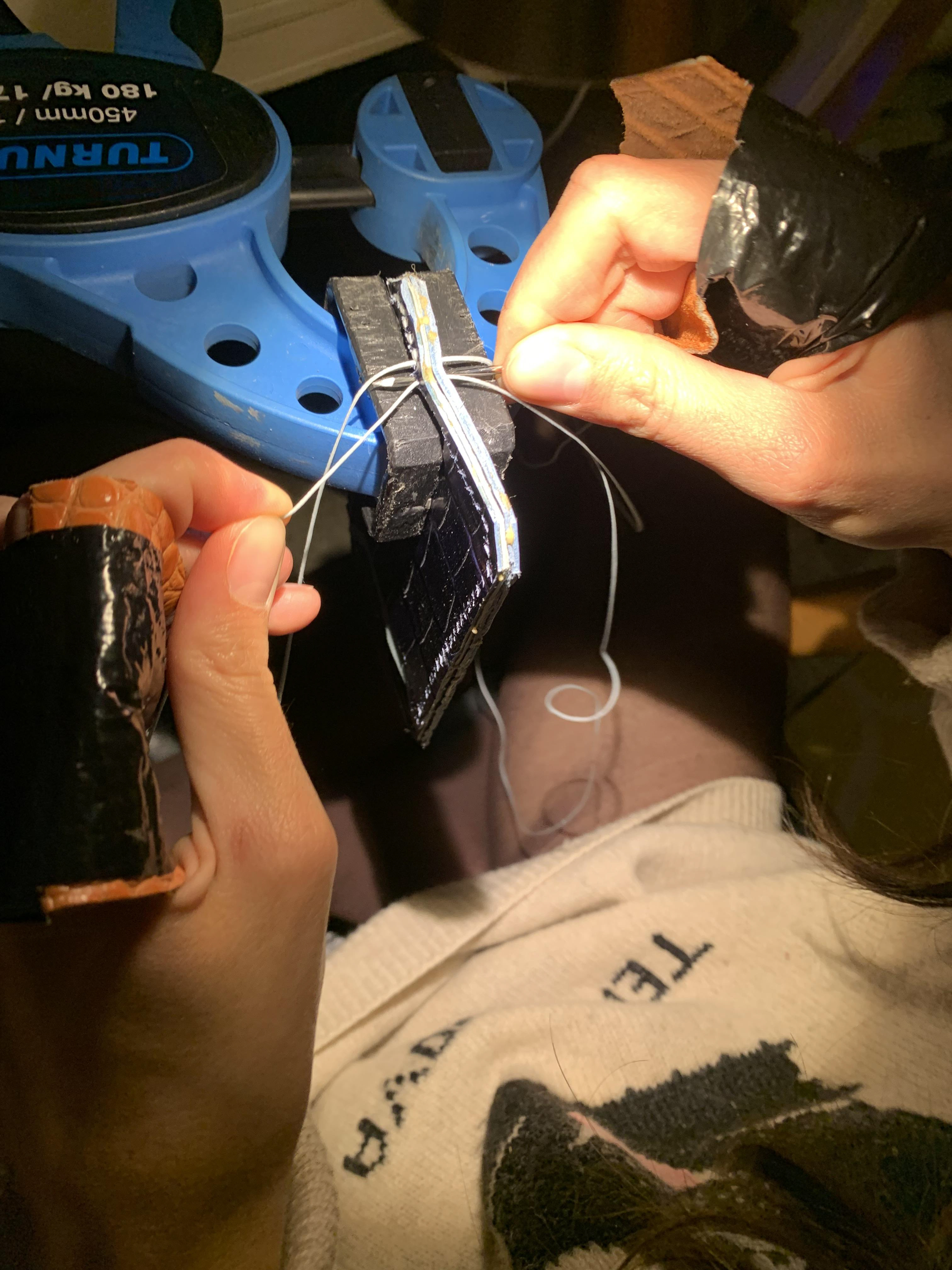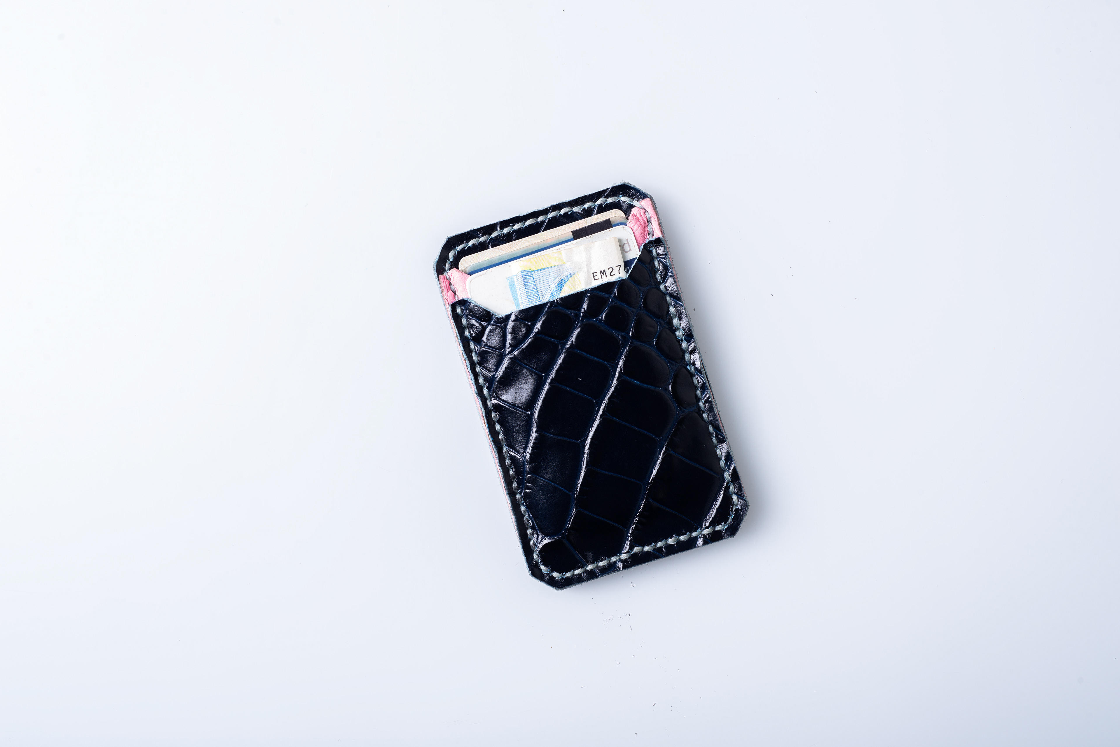Ho cucito dieci diversi portacartellini. Tutti sono fatti a mano, con le fustelle, gli aghi, e i fili cerati con uno spessore di 20. Al di sotto, si possono vedere, altri modelli di vari colori, che ho prodotto. Il progetto è stato realizzato per diversificare le forme di piccola pelletteria per UNÜTZER, e per reutilizzare i scarti del calzaturifico.