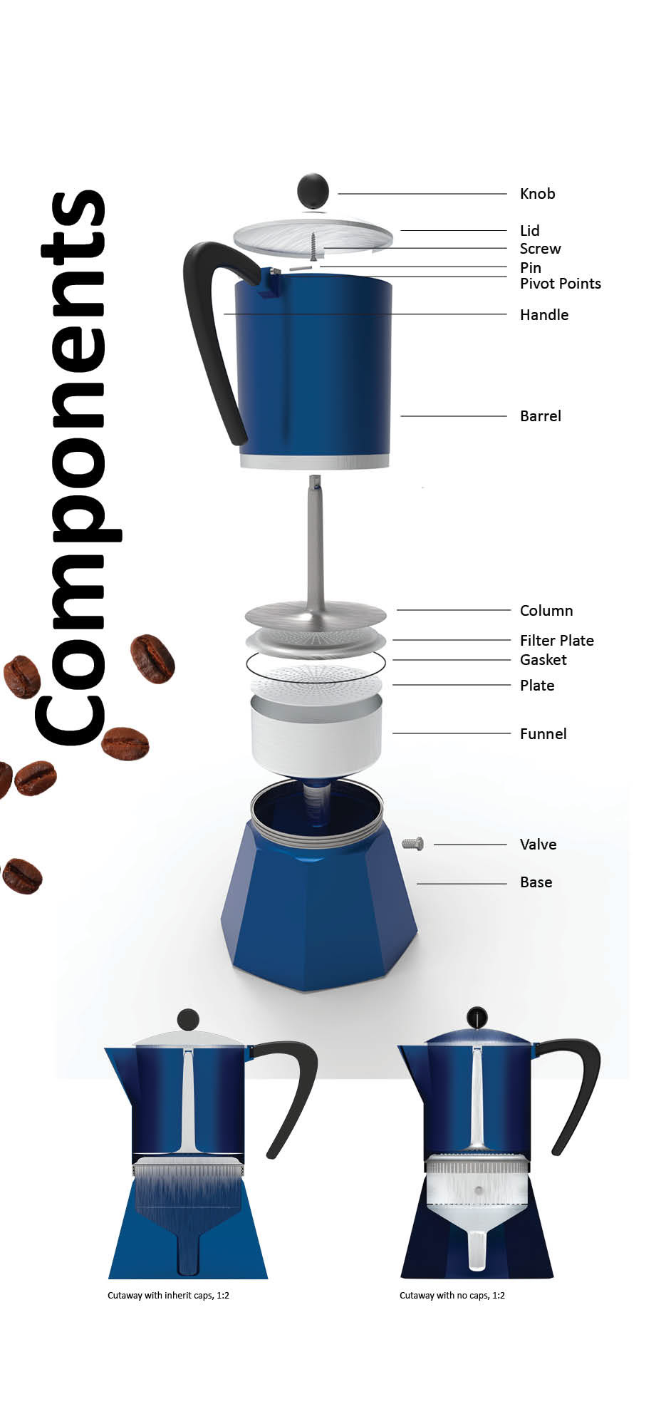 Alfonso Bialetti first acquired his metal-working skills by working for a decade in the French aluminium industry. By 1919 he had established his own metal and machine workshop in Crusinallo (in his native Piedmont) to make aluminium products: this was the foundation of the Bialetti company. He transformed his workshop – Alfonso Bialetti & C. Fonderia in Conchiglia – into a studio for design and production. These are some concept renders that I did for a University CAD class in which I used Rhino and Grasshopper to construct the technical 3D model of the coffee Mokka, and then subsequentially Key shot and Photoshop for high quality renders and mockups.
